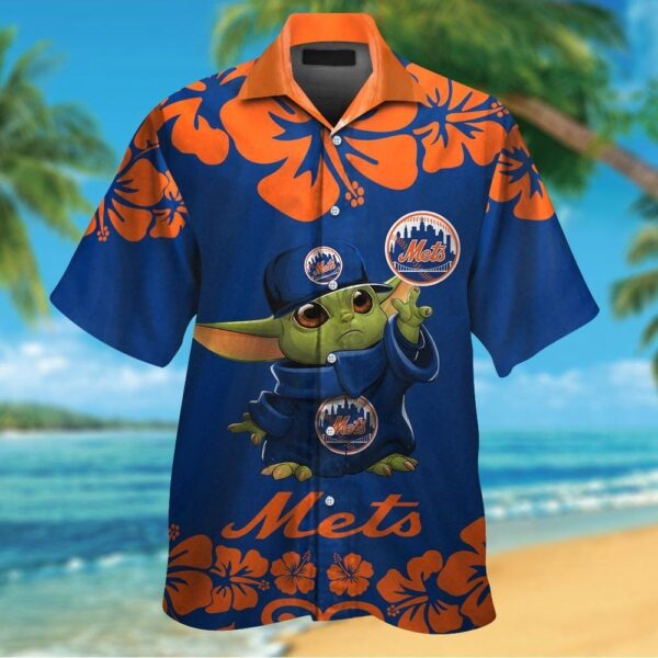 New York Mets Baby Yoda Short Sleeve Button Up Tropical Hawaiian Shirt
